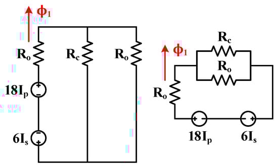 Figure 6 displays the equivalence of the reluctance generated by the passing flux produced in the left leg that was achieved by using the superposition theorem. Regarding the core structure, because the reluctances of both outer legs are the same, the equivalent reluctance passing through ϕ1 and ϕ3 are the same, as indicated in Equation (7). After the reluctance passing through the flux has been obtained, ϕ1 could be presented as Equation (8); although the equivalent reluctance of ϕ1 and ϕ3 are the same, ϕ3 could be presented as in Equation (9) because the MMF is different for each leg. Because the center leg had no windings, only the values of flux on the left and right outer legs are listed.