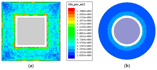 According to the obtained results, a three-legged core could achieve adjustable leakage inductance if the shape of the outer legs easily enables winding. Applying the winding coil is difficult when the commonly used PQ and RM cores are employed because of their outer leg shape; thus, EI or EE cores were used for adjustable leakage inductance [21]. The simulation results of the current distribution of the PCB trace windings based on the shapes of the PQ and EI cores were obtained with Maxwell magnetic simulation software. The simulation results presented in Figure 8 yielded the winding for the square core, and the current distribution obtained using the square core was considerably more uneven than that obtained using the round core, leading to excessively dense current at the corner of the winding, hot spots, and higher losses. Therefore, the cylindrical core was selected as the transformer core in this study.