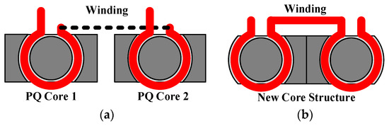 The design presented in Figure 9 was proposed to achieve adjustable inductance through winding on the two outer legs of the three-legged core and the obtainment of even current distributions on PCB windings. Producing adjustable leakage inductance required that windings be set only on the outer legs and not on the center leg. This method enabled the cross-sectional area of the center leg to be altered to a shape suitable for PCB winding, increasing the effectiveness of the winding space of the transformer. Therefore, this study proposed aligning two PQ cores (Figure 9a), where the connected part serves as the center leg of the core, and removal of one outer leg of the original core forms a new three-legged structure for the core. The design is as presented in Figure 9b.