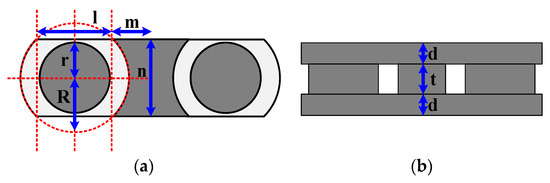 Figure 10 shows a diagram of the core size design in this study. Figure 10a is the top view, and r represents the radius of the effective cross-sectional area, R denotes the radius of the core that can be wound, l is twice the horizontal distance from the core cylinder to the highest point of the center leg, m is the maximum width of the center leg, n is the length of the core, d is the thickness of the top and bottom pieces, and t represents the leg height of the core.