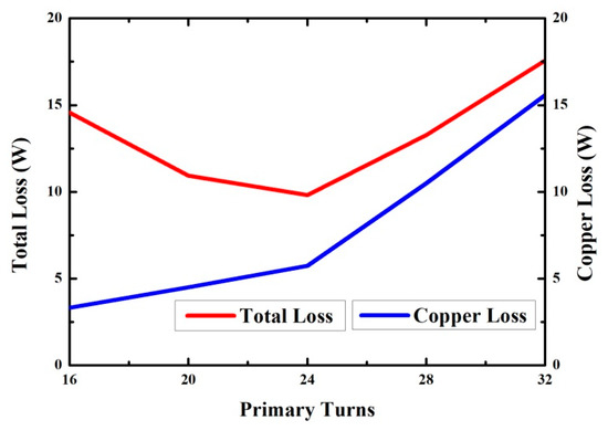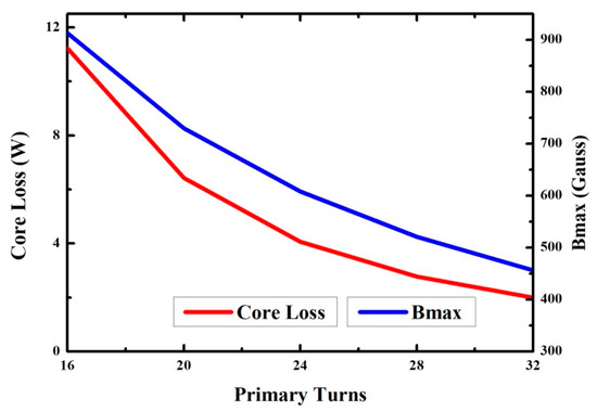 The peak flux density and core loss for different numbers of turns were obtained using Equations (24) and (26), and the results are plotted in Figure 11. The relationship between core loss and number of turns was nonlinear. The difference in core loss between 16 and 20 turns on the primary-side winding was 4.8 W, whereas 28 and 32 turns on the primary-side winding yielded a core loss of approximately 0.8 W. This was the main reason for designing Bmax to be less than 1000 G.