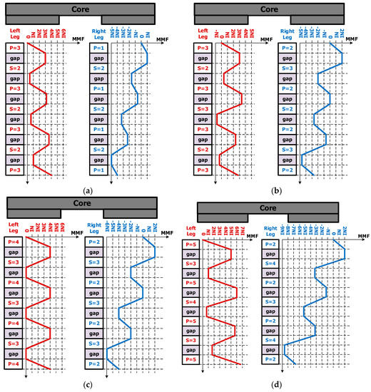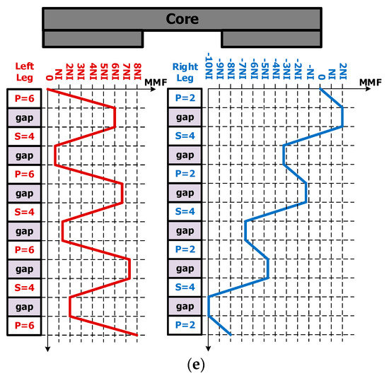 MMF distribution map of different numbers of windings: (a) Np = 16, Ns = 12; (b) Np = 20, Ns = 15; (c) Np = 24, Ns = 18; (d) Np = 28, Ns = 21; and (e) Np = 32, Ns = 24.