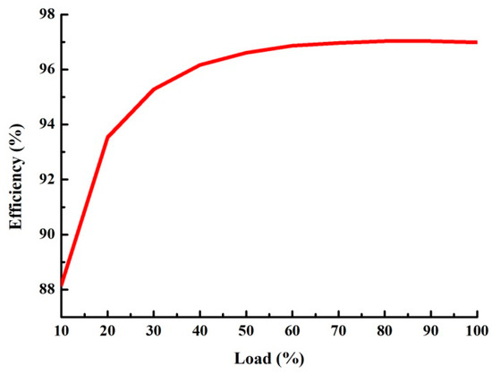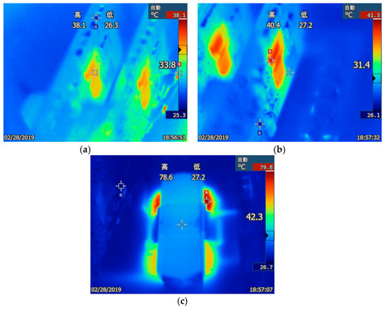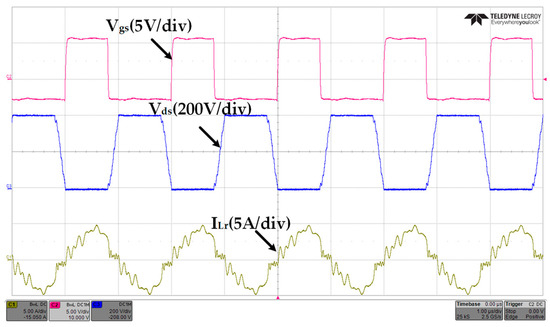 Figure 17 plots the measured conversion efficiency of the converter. The highest efficiency of 97.03% was achieved at 80% load. Figure 18 displays the circuit test waveform at full load, which includes the waveforms of Vds, Vgs, and the resonant current ILr of the primary-side power switch operating properly. Figure 19a–c shows temperature distribution of the primary-side power components at full load, with maximum temperatures of 38.1 °C, 40.4 °C, and 78.6 °C, respectively. Because the specifications of this paper are high-voltage to high-voltage, according to the loss analysis in Figure 4, the loss can be mainly attributed to the transformer, especially, on the transformer windings. Because the primary or secondary switching elements have zero-voltage-switch turn-on, the temperature distribution of the overall converter will be concentrated on the windings of the transformer.