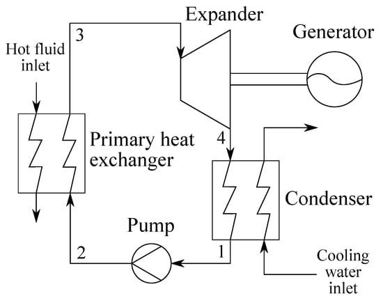 The ORC unit analyzed in this study consisted of an expander, a condenser (cond), a pump and a primary heat exchanger (PrHE) (see Figure 1). The heat input to the unit was provided by a hot water stream, while the heat released from condensation of the working fluid was transferred to a cooling water stream. The case of liquid heat source and sink fluids justified the use of counter-flow heat exchangers, which enabled the utilization of temperature profile matching in the primary heat exchanger and condenser. The mechanical power generated by the expansion of the working fluid was transferred to a generator, enabling the ORC unit to deliver a net power output () defined by the difference between the power consumption of the pump and the expander (neglecting electrical and mechanical losses):
