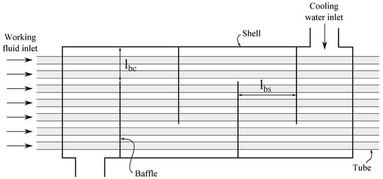 The model of the shell-and-tube heat exchanger was previously presented and verified by Andreasen et al. [25] and Kærn et al. [34]. The implementation of the Bell–Delaware method [35,36,37] was verified by comparison with the outline presented by Shah and Sekulić [31]. The cross-flow, leakage flow, and by-pass flow areas were predicted within 0.11% (discrepancies were due to rounding errors) of the values reported in Example 8.3 in Shah and Sekulić [31]. The shell side heat transfer coefficient and pressure drop for single phase flow of a lubricating oil were predicted within 0.15% (discrepancies were due to rounding errors) of the values reported in Example 9.4 in Shah and Sekulić [31]. The implementation of the condensation heat transfer correlation was verified to be within 0.8% of the predicted heat transfer coefficients for i-butane presented in Figure 5 in Shah [38]. Discrepancies can be attributed to inaccuracies in obtaining data points from the figure.