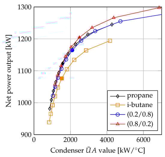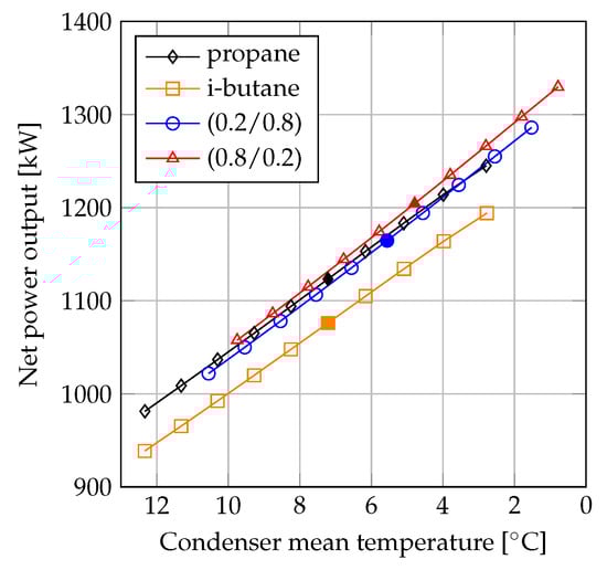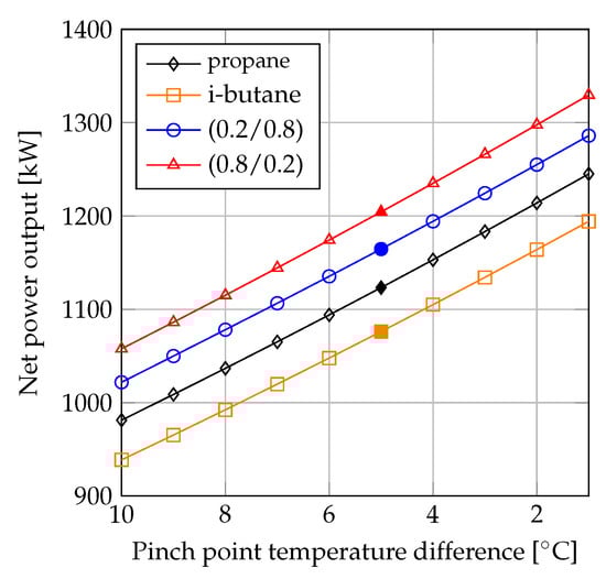 The plot depicted in Figure 9 displays the comparison of propane, i-butane, propane/i-butane (0.2/0.8), and propane/i-butane (0.8/0.2). Figure 9 is an alternative representation of the results presented in Figure 3 and Figure 6. Essentially, the difference between Figure 3 and Figure 9 is that the net power outputs are plotted as a function of instead of minimum pinch point temperature differences. The left most values (lowest and net power output) plotted in Figure 9 thereby correspond to the solutions with minimum pinch point temperature difference values of 10 C, while the right most values (highest and net power output) correspond to the solutions with minimum pinch point temperature values of 1 C. Note that the solutions with 1 C minimum pinch point temperature difference for the mixtures are outside the boundaries of the plot. The filled markers correspond to the solutions with minimum pinch point temperature differences of 5 C.
