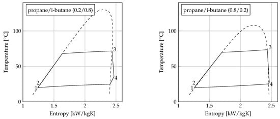 Generally, the results indicate that, when the fluid ranking was based on equal values of , the pure fluids performed better relative to the zeotropic mixtures than when the performance comparison was based on equal values of the minimum pinch point temperature difference. In the minimum pinch point temperature difference based comparison, 19 out of the 30 fluids were zeotropic mixtures (including the predefined mixture R422A). In this case, the zeotropic mixtures enabled up to 13.6% higher performance compared to the best pure fluid in each mixture. In the based comparison, only 12 fluids were zeotropic mixtures, since the composition of seven mixtures converged to 0% or 100% mole fraction. In this case, the performance increase of the zeotropic mixtures compared to the best pure fluid in each mixture was below 2.6%. High performance was reached for the transcritical mixture ethane/propane in both fluid rankings, but the composition changed from 88.3% (in Table 4) to 3.73% (in Table 5). The mixtures propane/butane, propane/i-butane, propane/pentane, propane/i-pentane and propane/hexane did not reach higher net power output than pure propane. It is also worth noting that, although ethane as a pure fluid reached the lowest net power output of the 30 fluids, it was possible to reach higher net power outputs than propane, butane, i-butane, pentane, and i-pentane by mixing small amounts of ethane in these fluids. The propane/i-butane mixture, which was analyzed thoroughly (see Section 3.1), did not reach higher performance than pure propane.
