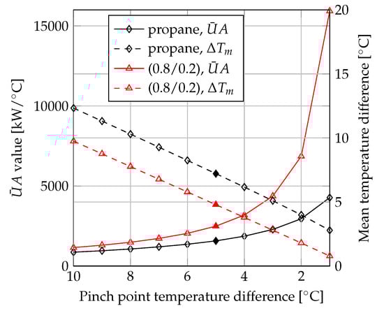 The variation of and for the condensers are depicted in Figure 5. When the minimum pinch point temperature difference was the same for the pure fluids and the mixtures, the heat transfer equipment used for mixture condensation was associated with larger values of and smaller values of mean temperature difference. The performance comparison was therefore affected by whether the fluids were compared based on the same values of the minimum pinch point temperature difference, mean temperature difference or .