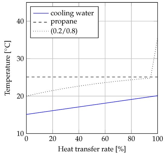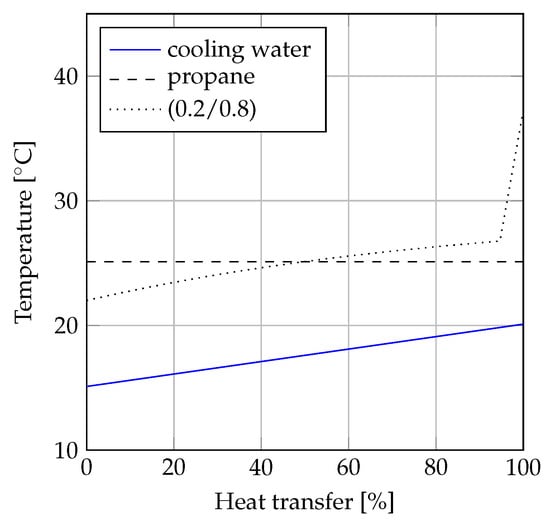 A comparison of the condensation processes for propane and propane/i-butane (0.2/0.8) is illustrated in the -diagrams (heat transfer rate versus temperature diagrams) depicted in Figure 7 and Figure 8. Figure 7 displays the comparison based on equal values of minimum pinch point temperature differences (C). The condensation process of propane is displayed as a horizontal line, since the optimum solution resulted in condensation from saturated vapor to saturated liquid. The optimum solution for propane/i-butane (0.2/0.8) involved 10 C of desuperheating. Disregarding the desuperheating process, the condensation process for propane/i-butane (0.2/0.8) was carried out at a lower temperature than the condensation of propane, resulting in a lower mean temperature for the mixture. Due to the match between the temperature glide of the mixture and the temperature increase of the coolant, the minimum pinch point temperature difference value could be achieved throughout most of the condensation process. This resulted in dissimilar mean temperatures for the pure fluid and the mixture. The mean temperature was C for propane, while it ess C for the mixture. When the pinch point temperature difference of propane/i-butane (0.2/0.8) was increased by 2 C, the mean temperatures of the two fluids were equal. This situation is displayed in Figure 8. When C for both fluids, the temperature difference between the coolant and the condensing working fluid was lowest for the mixture in the left half of the -diagram (from 0% to 50% heat transfer rate), while it was lowest for propane in the remaining part of the diagram (from 50% to 100% heat transfer rate).