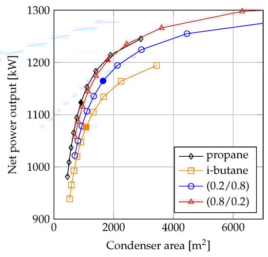 Figure 10 shows the results of the fluid comparison when the fluids are rated on equal values of heat transfer area for the condenser. Similar to Figure 9, the plots in Figure 10 were generated based on the optimized solutions from Figure 3. The heat transfer areas were calculated based on the outputs (pressures, temperatures and mass flow rates) from the thermodynamic ORC process model by using the shell-and-tube heat exchanger model with conditions listed in Table 3. For each fluid, the lowest condenser areas in Figure 10 correspond to minimum pinch point temperature difference values of 10 C, while the highest condenser areas correspond to minimum pinch point temperature values of 1 C. The filled markers denote the solutions with a minimum pinch point temperature difference of 5 C.