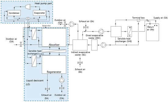 - Shin, J.H.; Park, J.Y.; Jo, M.S.; Jeong, J.W. Impact of heat pump-driven liquid desiccant dehumidification on the energy performance of an evaporative cooling-assisted air conditioning system. Energies 2018, 11, 345. [Google Scholar] [CrossRef]