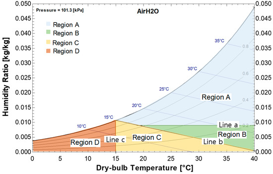 Based on existing research [2,3,4], the operation modes of the LD-IDECOAS can be divided into four modes according to the thermodynamic conditions of the incoming fresh air (OA) on the psychrometric chart in Figure 2. As shown in Figure 2, the psychrometric chart is divided by three lines, “a”, “b”, and “c”. Line “a” stands for the target humidity ratio (HR) of the SA, line “b” represents the wet bulb or the enthalpy of the SA set point, and line “c” is the dry-bulb temperature (DBT) line of the SA set point.