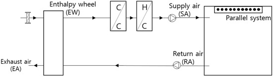 As seen in Figure 3, the DOAS is a ventilation and dehumidification system that uses 100% outdoor air. The system adopted in this study consists of an enthalpy wheel (EW), a cooling coil (CC), and a heating coil (HC), and is integrated with ceiling radiant panels as a parallel sensible cooling and parallel sensible heating system. The EW is used to recover both sensible and latent energy of the EA (primarily dehumidify the process air in the cooling season). The CC is used to dehumidify the process air to meet the target HR. The HC is used to preheat in the cooling season (i.e., 15 °C) and heat the process air to achieve the SA set point temperature in the heating season (i.e., 20 °C). When the space sensible is higher than DOAS capacity, the parallel system is enabled to remove the remaining sensible load. Otherwise, the parallel system is turned off. When the parallel system is enabled, the chiller is supplied to both the CC and the parallel system [13].
