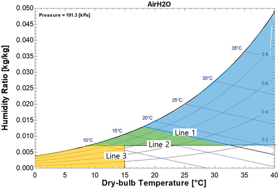 Referring to previous research [2,15,16], the operation modes of the adopted DOAS are classified as four modes. These are represented by four regions divided by three lines, according to the thermodynamic conditions of the OA on the psychrometric chart shown in Figure 4. The three lines dividing the psychrometric chart are named lines “1”, “2”, and “3”. Line “1” is the enthalpy line of the EA. Line “2” is the line of the target HR of the SA, and line “2” is adjusted according to the change in the latent heat load in the target room. Line “3” is the DBT line of the SA (i.e., 15 °C in the cooling season, 20 °C in the heating season).