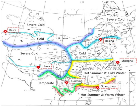 China has a vast territory, a special geographical location, and complex terrain. Owing to its different geographical latitudes, topography, and other conditions, the climate varies greatly from place to place. Therefore, for different climatic conditions, the energy-saving design of buildings around the country should be different. In order to clarify the scientific relationship between architecture and climate, China’s General Principles for Civil Building Design GB 50352-2005 [17] divides China into seven main climate zones. These regions mainly include severe cold regions, cold regions, hot summer and cold winter regions, hot summer and warm winter regions, and mild regions.