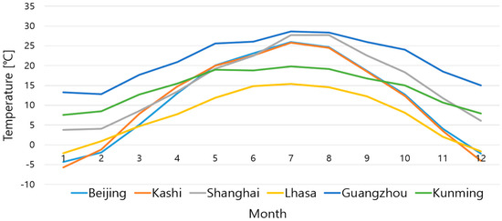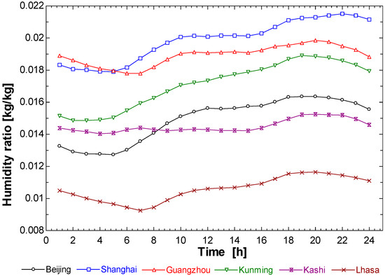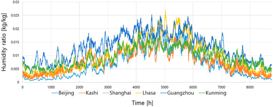 The six selected cities are part of six different climate regions, as shown in Figure 5. They are Beijing, Lhasa, Kashi (severe cold regions), Shanghai (hot summer and cold winter regions), Guangzhou (hot summer and warm winter regions), and Kunming (mild regions). These have distinctly different outdoor air conditions and different annual changes. The first three cities belong to a relatively dry climate region, Kunming is a relatively neutral climate region, and the rest are relatively humid climate regions. The differences in the temperature and humidity ratios for the six selected cities can be seen in Figure 6 and Figure 7.