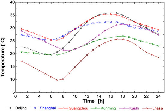 The analysis of the different climate characteristics of each selected city is as follows. It seen from Figure 8, Figure 9 and Figure 10 of the six selected cities that the thermal environments of the peak days of each city have distinct characteristics. Although Beijing, Kashi, and Lhasa belong to the same climate region, they show significant differences in Figure 11 and Figure 12 because of their special geographical location and geographical environment, but generally exhibit the three lowest HRs of the six selected cities.