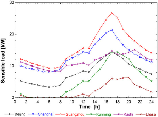 In order to more clearly see the performance characteristics of each system in different climate regions, we selected the peak days of each city as objects for comparison. This part selects the peak day of each selected city and conducts a detailed comparative analysis through thermal conditions from TRNSYS18, such as the temperature (Figure 8), HR (Figure 9), and cooling load (Figure 10). Comparisons of the temperature, HR, and cooling load of each selected city are shown in Figure 8, Figure 9 and Figure 10. Since the latent heat load values of the various cities are similar, they are not shown in the cooling load figure.