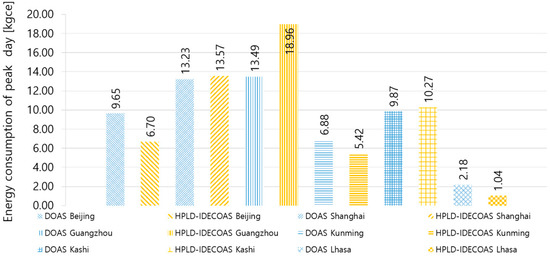As can be seen from Figure 11, in the peak day of the cooling season, the daily energy consumption of the HPLD-IDECOAS operating in Guangzhou is the highest of the 12 cases, and the daily energy consumption of the HPLD-IDECOAS operating in Lhasa is the lowest. In terms of the peak day, the energy consumption of the HPLD-IDECOAS in Guangzhou is 40% higher than the DOAS, and is similar to the DOAS in Shanghai and Kashi, and in other cities, the daily energy consumption of the HPLD-IDECOAS is generally lower than that of the DOAS operating under the same conditions. The energy saving rates of the system operating the different cities are, from high to low, 52% in Lhasa, 30% in Beijing, and 21% in Kunming.