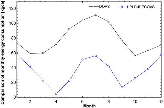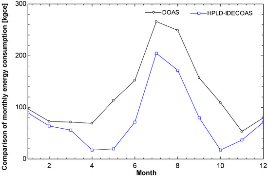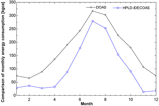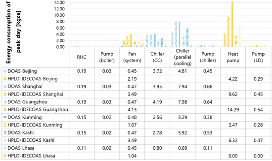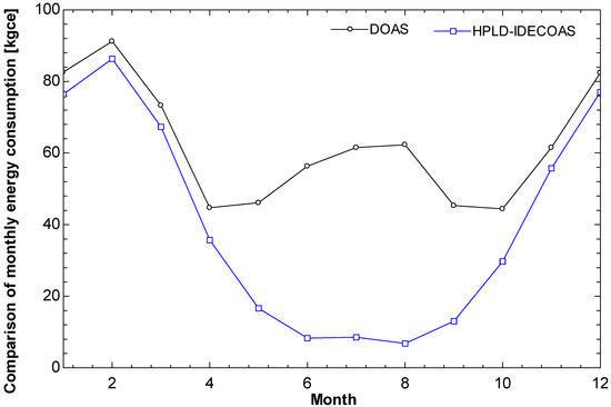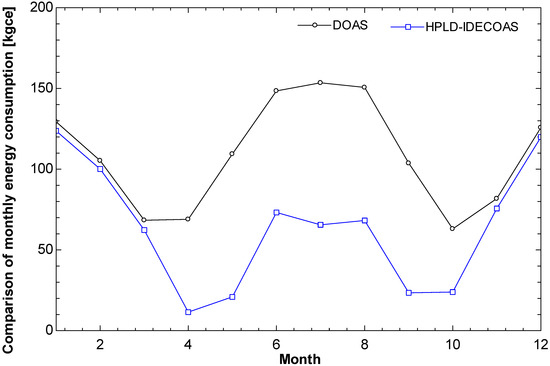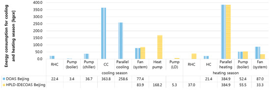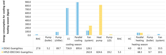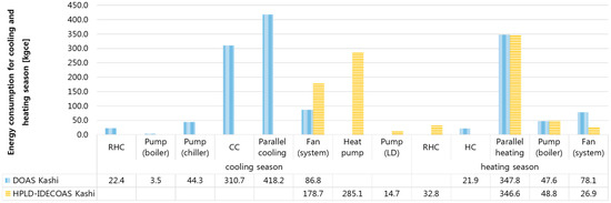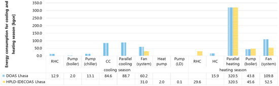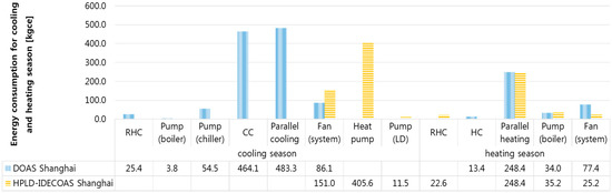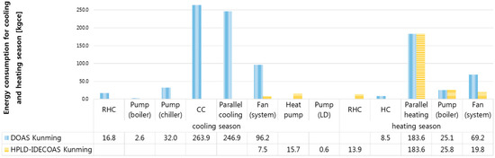 The main energy consumption of the DOAS is the use of the dehumidification part of the CC and RHC, whereas the main energy consumption of the HPLD-IDECOAS is the heat-pump-integrated LD system.