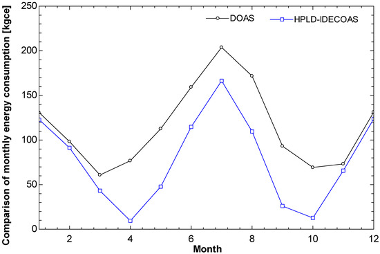 The HPLD-IDECOAS uses more energy than the DOAS for dehumidification (scilicet, the energy consumption of the HPLD system is more than that of the chiller (CC), RHC, and pump (boiler) of the DOAS). However, owing to the use of the IEC and DEC for cooling in HPLD-IDECOAS, the overall energy consumption is lower than the DOAS using a chiller (parallel cooling).