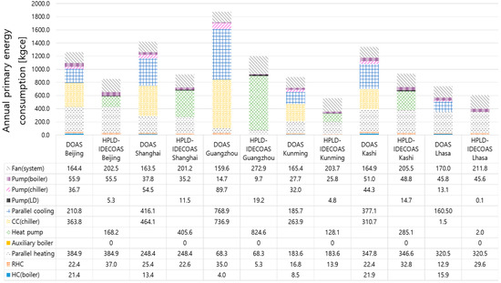 According to the EES simulation results of the peak day, monthly, seasonal, and annual energy consumptions of the two systems in each selected city, the applicability difference between the two systems in the selected climate regions represented by each selected city is analyzed, to find the lowest energy consumption in both systems. The operating energy consumed in each system was concerted to primary energy by using local conversion factors of 0.1229 kgce/kWh and 0.03412 kgce/MJ (0.009478 kgce/kWh) for electricity and thermal energy, respectively [29].