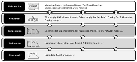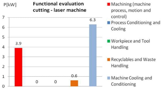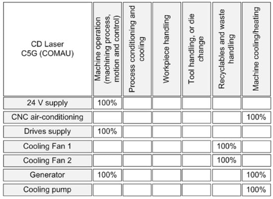 Each component was assigned to predefined functions according to ISO 14955-1 as shown in Figure 4 and Figure 5. Representing the connected load of the component, the e-scheme was used for selecting components from the whole machine. The estimation results showed which components were significant energy consumers. The proposed functional analysis was that machining and cooling conditioning were major consumers. Physically, machining functions were conducted by a robot arm and laser generator. For cooling conditioning, the chiller was the major part. The sub-components of major consumers were joint motors, laser diodes, laser disks, and the water compressor. The laser scanner of the robot arm was a relatively minor consumer compared with joint motors.