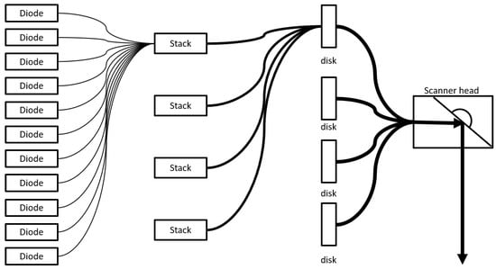 The structure of the laser source influences the energy produced by laser generation. For the case study, a Trumpf TruDisk 4002 was used. This is a high-power laser source concentrating 176 low-power diode laser sources through four disks []. A single stack consisted of 11 diode bars generating 100 W of laser power. Sixteen stacks transferred the laser into 4fourserial disks chilled by the coolants. The overall structure is illustrated in Figure 6. Each disk was connected with the optical structure to collect small diode laser sources. Collected laser power reached 4 KW and a 1-Mfocal length. This performance enabled welding robots to cover a wide area with only laser scanner movement [].