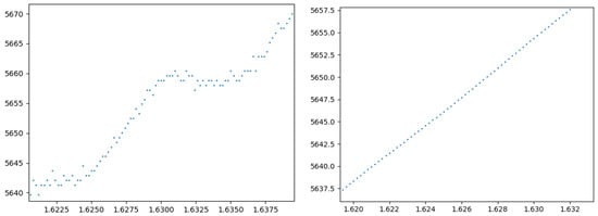 Condition (2) did not lead to convergence of the loss function. The comparison between (1) and (3) is shown in Figure 14 and Figure 15. The features of exponential and log functions caused the high peaks of each stitch. In the comparison between Mode 1 and Mode 2, the 5 × 10 two-layered network showed the highest accuracy in Mode 1, while the 10 × 15 × 5 network was better in Mode 2, as shown in Figure 16 and Figure 17 and Table 1. In the table, MAPE (Mean Absolute Percentage Error) showed the gap between the estimated value and the measured value with the following equation.