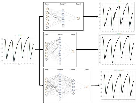 Secondly, the proposed neural network models were trained with two mode types in order to show how much the distinction between cooling and laser launch affected the accuracy. The variations of the network model generated up to 10 nodes and three layers, as shown in Figure 10. The random seed was changed automatically. Each variation was tested with different layer configurations so as to find the best configuration.