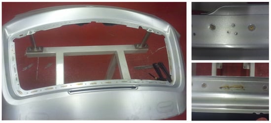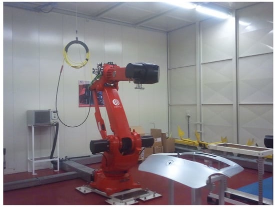 The proposed methodology described in the previous section was applied to the RLW of a car rear door assembly. This case study introduced the method for application of the integrated approach to a real product and showed how the proposed approach can improve the accuracy. The estimation model was implemented using RapidMiner 9.2. The process approach was applied to robot programming written in COMAUPDL2. Assembly of the car rear door parts involved a combination of welding positions in a set of 10 continuous stitches and 19 dimples made by a single laser welding robot with a fixed work-in-process on a single fixture (Figure 11). The COMAU SmartLaser consisted of a robot arm and laser machine. The robot arm had two parts. The first part had four revolute joints and the second part another three laser manipulators. Figure 12 shows the experimental setting of the SmartLaser and the rear door assembly on the fixture. Further details of the robot arm can be found in Erdős et al. [].