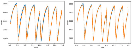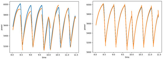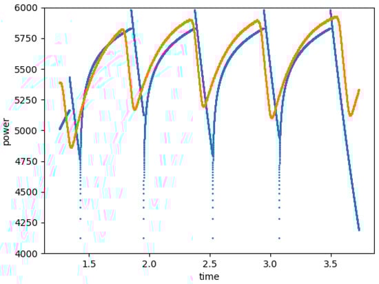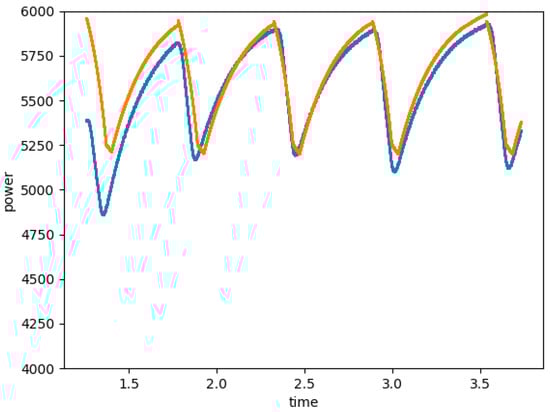 The filtered data were applied to the peak detection algorithm, which utilized continuous wavelet transform-based pattern matching to find the highest point in each welding process. The algorithm was described by Pan et al. [] with detail. Low peaks were collected in , while high peaks were stored in . The measured power data were represented in . Mode 1 used process time and starting power of each welding profile as the input of neural network. Mode 2 divided each welding profile into welding status and cooling status. Welding mode and cooling mode are defined in the following equation.
