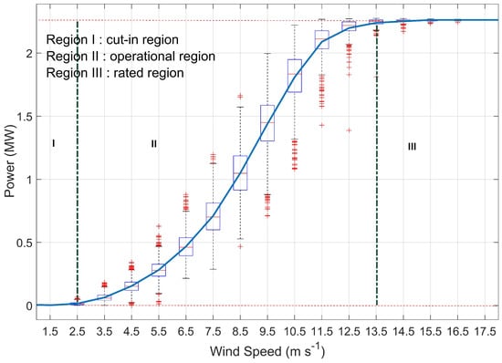 Power curve for the 2.5 MW study turbine, derived using ten-minute data from 20 February to 18 June 2018 and bins of 1 m·s−1. Cut-in region, operational region and rated region are shown.