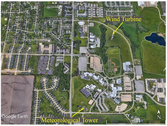 The data used in this study were collected from the site of a stand-alone wind turbine located on the northeastern side of Kirkwood community college campus in Cedar Rapids, Iowa. The wind turbine was built in 2012 and generates power for the campus. There is also a tall meteorological evaluation tower (met tower) located at a distance of 900 m south of the wind turbine. The met tower is used to characterize the atmospheric boundary layer (ABL) conditions at the site. Data from a period of approximately four months—from 20 February to 18 June 2018—were used in this study. More information about this site can be found in [19].