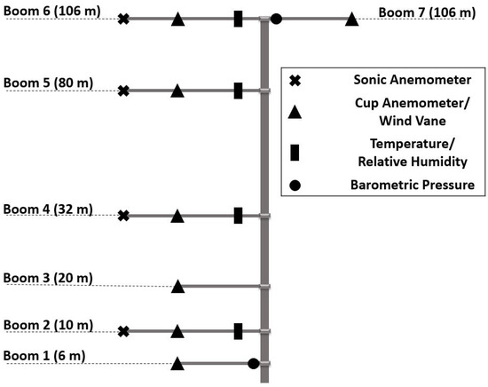 In August 2017, a 106 m tall meteorological tower on the southwestern side of the campus was instrumented at several heights in order to characterize the atmospheric boundary layer near the turbine. Table 1 provides a list of all sensors on the met tower. These sensors are mounted on seven booms at six different heights, with two booms on top of the tower oriented in opposite directions.