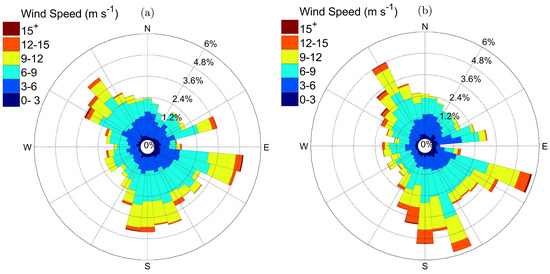 Wind rose at the site of the wind turbine from: (a) SCADA data; and (b) met tower data. Wind rose were generated after quality checks were applied to the data for the period of study.