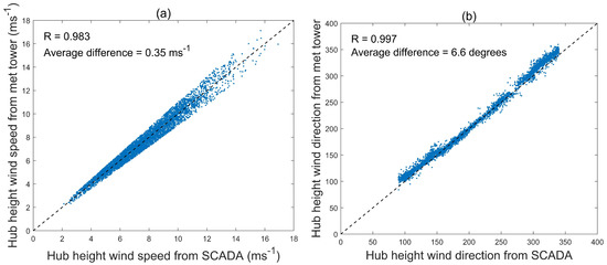 Ten-minute averaged Hub height (a) wind speed and (b) wind direction measurements from SCADA and met tower data after preliminary quality checks. The dashed diagonal line shows a 1:1 relationship. It should be noted that wind direction at hub height from met tower was not available during the period of study due to sensor failure, and it was interpolated from wind direction at 32 m and 105 m.