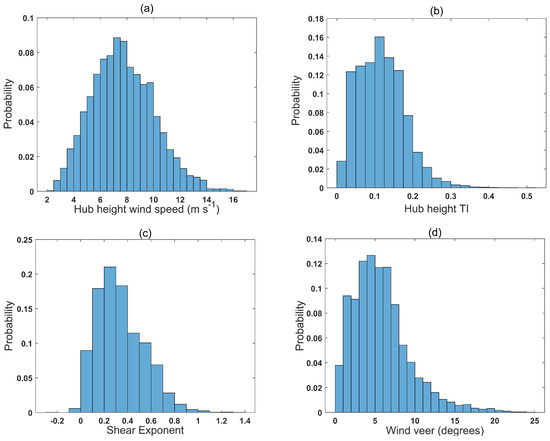 The observed distribution of meteorological variables based on ten-minute averaged data: (a) hub height wind speed (m·s−1); (b) turbulence intensity (TI) at hub height; (c) shear exponent; (d) wind veer (degrees); and (e) air density at hub height (kg·m−3).