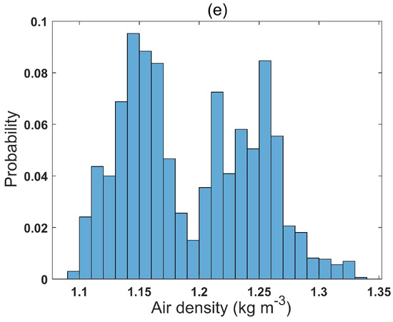 Another important meteorological variable that affects wind turbine power generation is air density. Air density is linearly related to power production and its effect is accounted for by adjusting wind speed for density variations in Equation (2). In this equation, a reference density ( = 1.225 kg·m−3) is used to normalize air density variations. Ambient pressure, temperature, and relative humidity measurements were used for calculating air density at hub height. The distribution is shown in Figure 7e. As it can be seen, air density at this site varies considerably with a mean value of 1.19 kg·m−3 during the four-month period of study, which is close to the reference density.