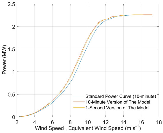 Standard power curve versus ten-minute and one-second versions of the model based on bins of 0.5 m·s−1 and = 1.225 kg·m−3.