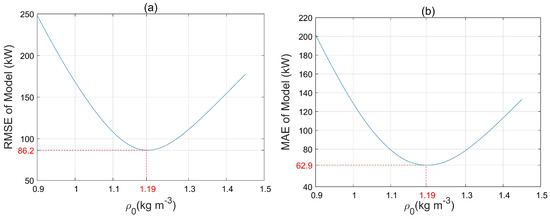 Changes in the distribution of , result in a change in the prediction accuracy of the model. Figure 11 shows how and of the model change for different values of reference density. The optimum value for reference density was found to be = 1.19 kg·m−3, which coincides with the mean value of density over the whole four-month period of study and it is in agreement with IEC recommendation for generating power curves [16]. This value for reference density results in the lowest values of = 86 kW and = 63 kW.