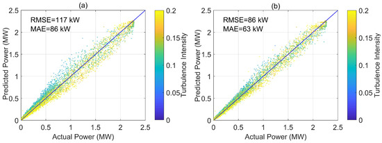 where is the actual power and is the predicted power. Lower and indicate more accurate power prediction. The two above measures have been previously used for quantifying accuracy of prediction models and represent expected error associated with each predicted data point [1]. Figure 9 shows the performance of the three discussed models in power prediction. Actual power is plotted on the x-axis, while predicted power is plotted on the y-axis. The diagonal shows a 1:1 relation, representing the ideal prediction; the more a model deviates from the diagonal, the more error. The color bar represents turbulence intensity. From Figure 9, we can deduce that all models tend to under-predict power production in high turbulence intensity cases, while they tend to over-predict low turbulence intensity cases. This error tells us that turbulence intensity has a systematic effect on power generation in all three models. Both modified power curves result in a higher accuracy in power prediction, however the systematic behavior of turbulence intensity is still apparent in both of them, which suggests further investigation is needed on the effect of turbulence. Figure 9a shows the performance of standard power curve, which results in = 118 kW and = 87 kW. Figure 9b,c show the performance of the ten-minute and one-second versions of the model, both of which perform better than standard power curve with lower and . It is also apparent from the plots that the amount of scatter among the data points is decreased in both versions of the modified model and all data points are closer to the diagonal. In the ten-minute version of the model, is decreased to 89 kW and is decreased to 64 kW, which is a 24% improvement in prediction in terms of both and . The one-second version results in = 87 kW and = 63 kW, a 26% improvement in prediction of power compared to standard power curve, therefore there is only a slight improvement compared to the ten-minute version of the modified model. From this point forward, we focus on the ten-minute version of the model since it requires fewer data, and results in a similar accuracy in prediction.