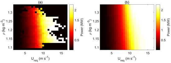 Figure 13a shows the two-dimensional binning of wind power in terms of and . The bin width along the axis is chosen to be 0.5 m·s−1 according to IEC [16]. To have roughly equal number of bins along the axis, the bin width along this axis is set to be 0.01 kg·m−3. Available data are transferred onto two-dimensional bins and generated power is averaged over each bin as shown in Figure 13a. Because the available data do not cover the whole area of feature space, wind power is linearly interpolated along the axis to fill the whole feature space, as shown in Figure 13b. Then, interpolated two-dimensional binned date are used to create a three-dimensional power surface, as shown in Figure 14.