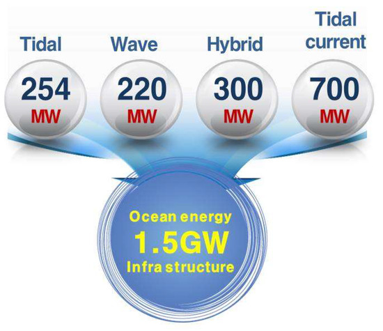 Figure 3 presents The Strategic Plan for Development and Support of New and Renewable Energy such as Ocean Energy announced by the Ministry of Oceans and Fisheries (MOF) in 2017. The MOF plan includes a 2030 Development Plan for Ocean Energy. In addition, the MOF 2017 plan has four strategies and it is summarized as follows:
