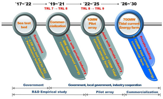 In case of tidal current energy, there are detailed plans for the development of large-scale tidal energy farms. As shown in Figure 4, first, the open sea test bed will be established by 2022 for performance test and evaluation of TEC. This will facilitate expanded research of tidal current energy and enable the establishment of a practical testing system. After the establishment of sea test bed, development of the commercial level system for TEC will be carried out. The goal is to develop the MW class TEC to establish the commercialization. Thus, the plan will promote technological development of tidal current energy in Korea. Additionally, Korea plans to construct a 10 MW pilot array in the southwestern sea of Korea using the MW class TEC. Finally, between 2026 and 2030, a 700 MW tidal current energy farm will be constructed around the southwestern sea of Korea.