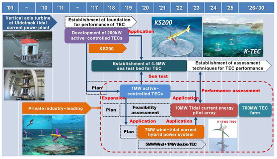 Figure 5 shows the status of research on tidal current energy conducted by the Korea Institute of Ocean Science and Technology (KIOST). As shown in Figure 5, KIOST has researched the commercialization of tidal current energy since 2001 and is now developing a 200 kW TEC. In 2022, KIOST plans to establish the 10MW tidal current energy farm.