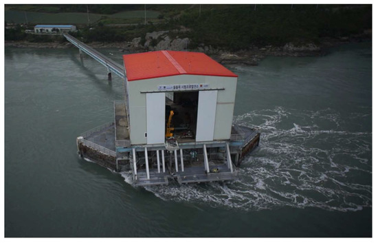 Since 2001, KIOST has researched tidal current energy. In the course of this research, KIOST constructed the Uldolmok Tidal Current Power Pilot Plant which has an installed capacity of 1 MW. Figure 7 is a photo of the Uldolmok Tidal Current Power Pilot Plant, which is located at Uldolmok, Jindo, Korea.