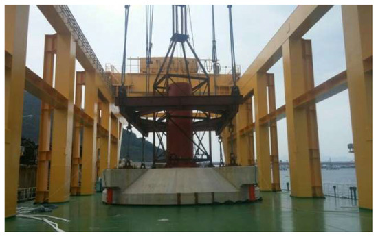 The support structure is the part of TEC that consists of the tower, substructure and foundation [25]. For this project, the caisson-type gravity-based support structure was selected owing to factors associated with installation and maintenance. It was designed, fabricated and deployed by Hyundai Engineering and Construction Co., Ltd., which is located in Seoul, Korea, in 2016. The foundation width is 15 m in diameter, the height of the tower is 9.5 m and a total of weight is 350 tons. Figure 8 shows the support structure of a 200 kW TEC on the Myeongnyang vessel specially launched by Hyundai Engineering and Construction Co., Ltd.