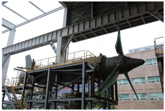 In 2017, the performance of the Permanent Magnet Synchronous Generators (PMSG) and the main Drivetrain were evaluated using a portable dynamo test facility. The internal communication system and the active rudder device for automatic and passive yaw control have been also tested in indoor and underwater environments, as shown in Figure 9. The test report issued by Korea Electrotechnology Research Institute (KERI) found that generator efficiency was 89.5%.