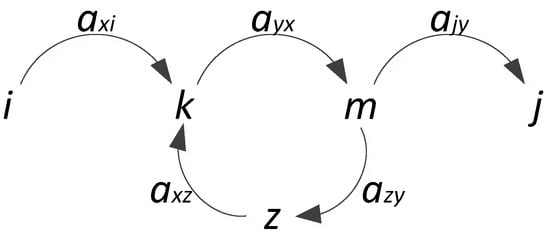As shown in Figure 1, the structural path method regards each endogenous account in SAM as a knot, and the relationship between any two knots is expressed in arc . The elements in the average expenditure propensity matrix are defined as the magnitude of the influence transmitted from the knots (expenditure account) to the knots (revenue account), and are usually expressed as the intensity of the arc .